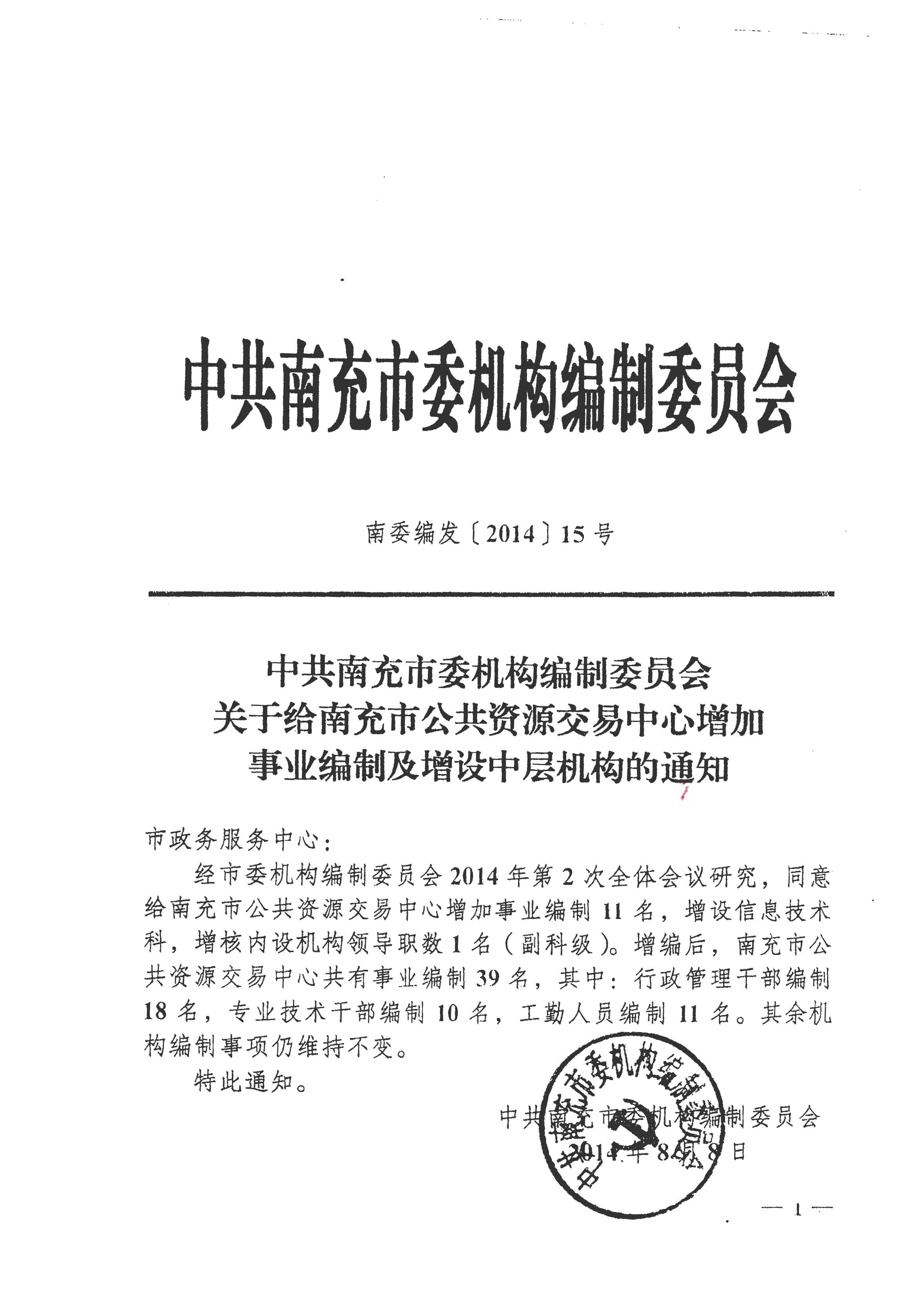 中共南充市委機構(gòu)編制委員會關(guān)于給南充市公共資源交易中心增加事業(yè)編制及增設(shè)中層機構(gòu)的通知
