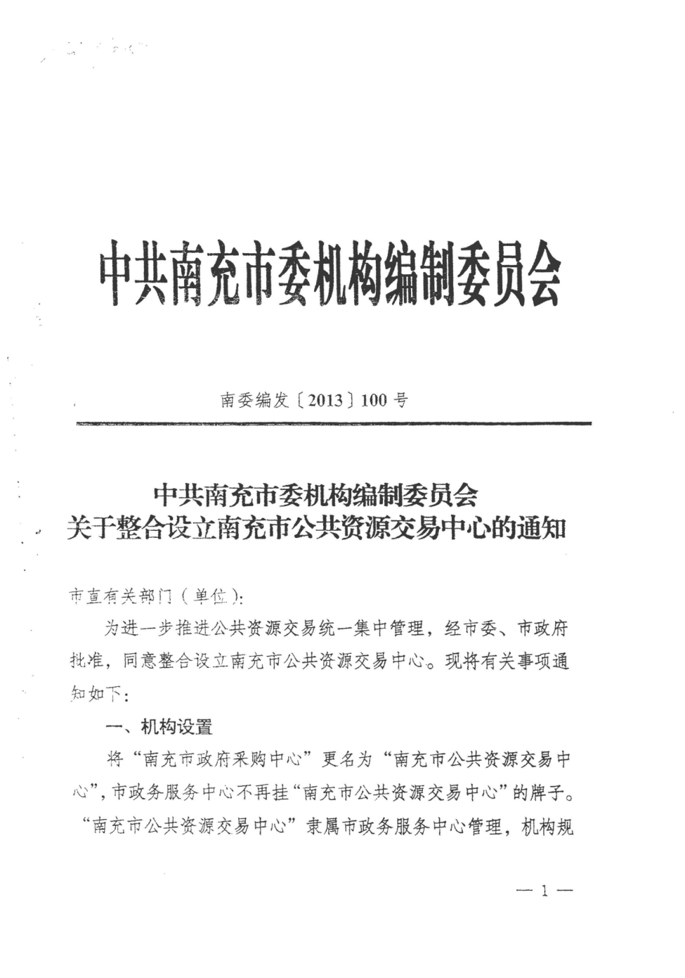 中共南充市委機構(gòu)編制委員會關(guān)于整合設(shè)立南充市公共資源交易中心的通知