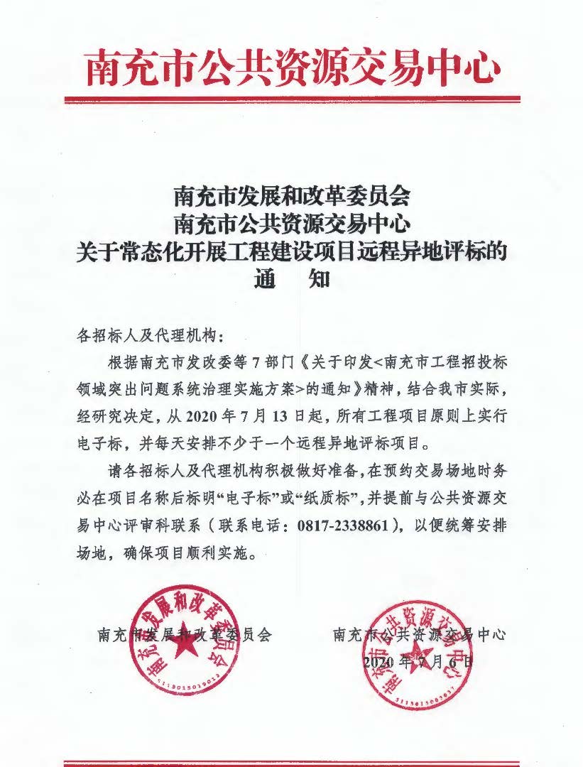 南充市發(fā)展和改革委員會(huì)、南充市公共資源交易中心關(guān)于常態(tài)化開展工程建設(shè)項(xiàng)目遠(yuǎn)程異地評(píng)標(biāo)的通知