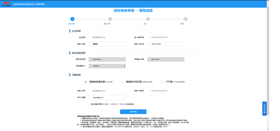 (注:申請保單過程中如遇特殊情況退出頁面,可通過點(diǎn)擊繳納保證金頁面的保單申請重新進(jìn)入,系統(tǒng)自動跳轉(zhuǎn)至上一步未完成頁面)