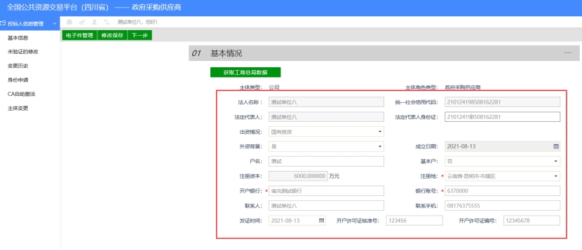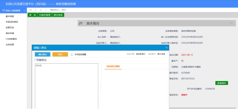 3、完成后點擊“下一步”,進(jìn)入頁面最后點擊“提交信息”,等省交易中心審核通過后即可:
