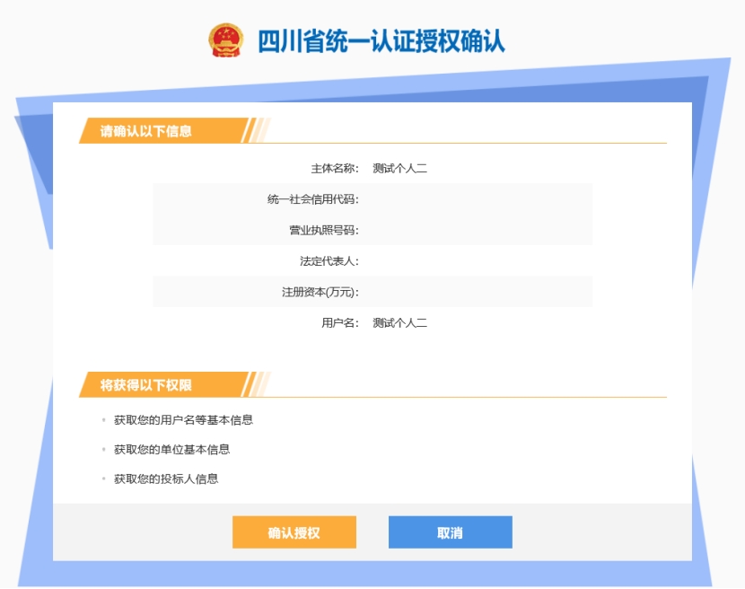 2、登陸后在此頁面點擊“四川省電子招投標(biāo)公共服務(wù)平臺”,并點擊確認(rèn)授權(quán):
