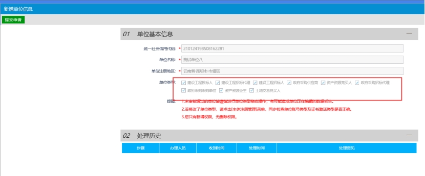 2、在身份新增頁面,勾選需要增加的身份類型(注意此處已申請的身份無法刪除),完成點擊左上角的“提交申請”,等省交易中心審核通過即可: