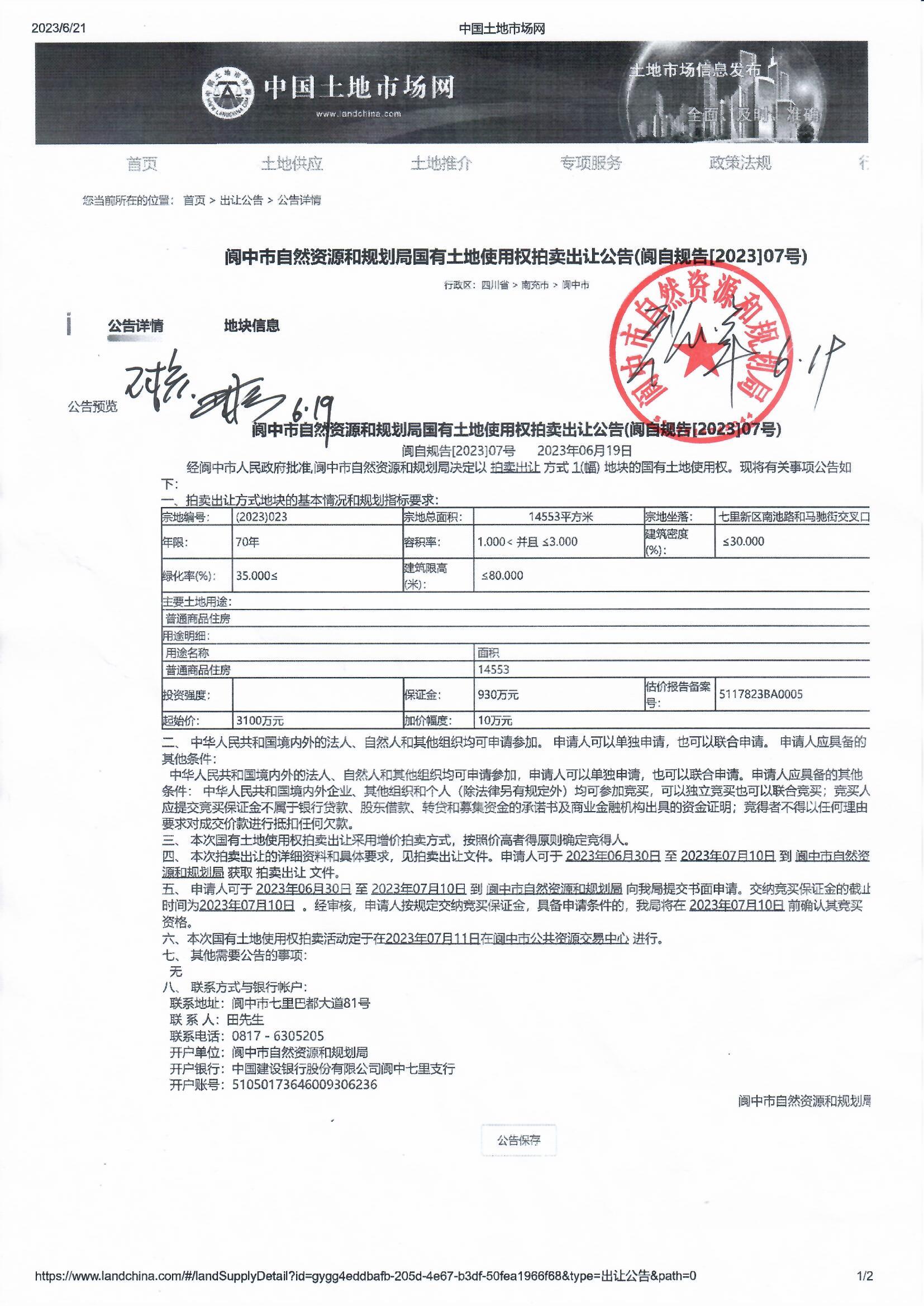 閬中市自然資源和規(guī)劃局國(guó)有土地使用權(quán)拍賣出讓公告(閬?zhàn)砸?guī)告[2023]07號(hào))