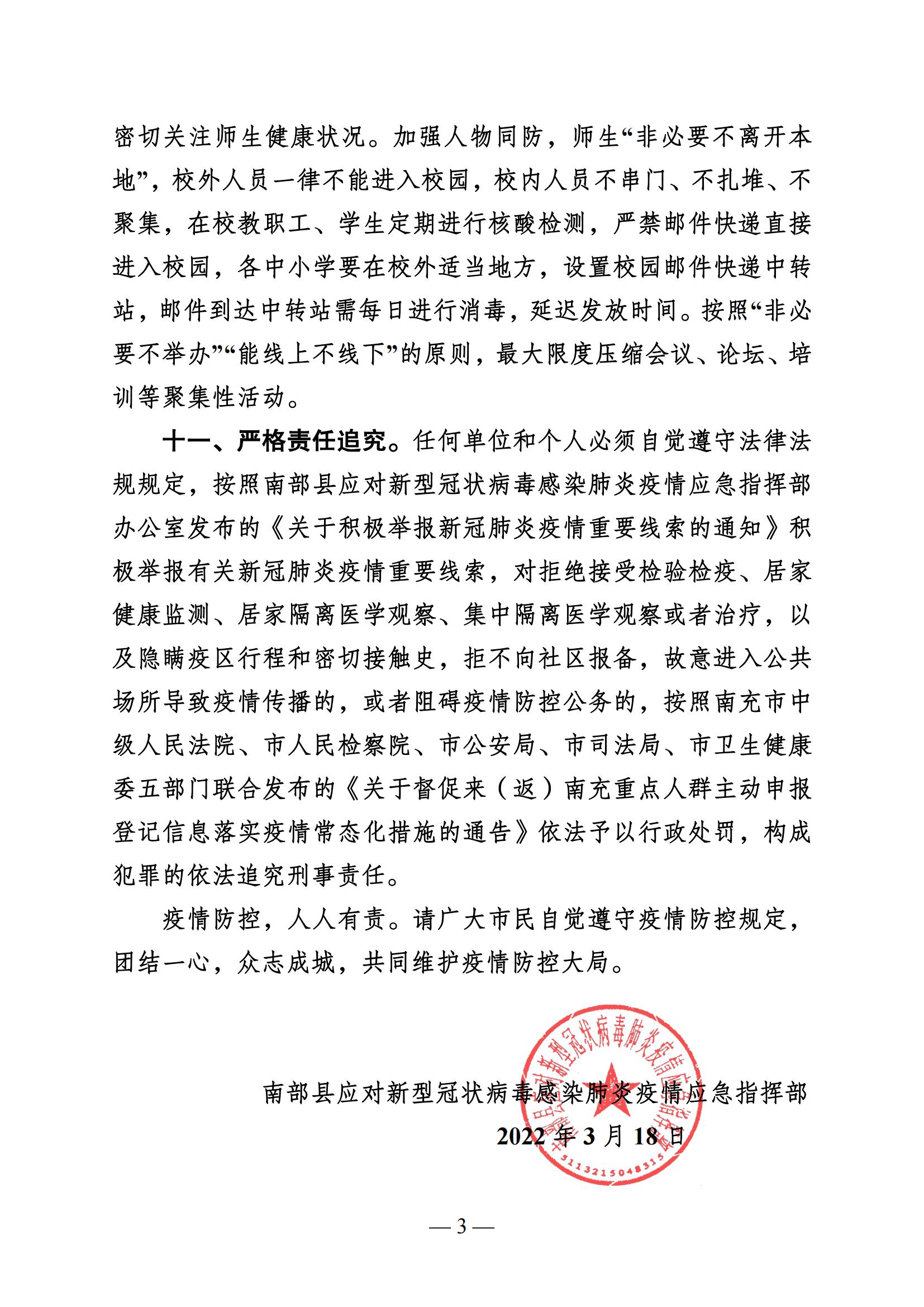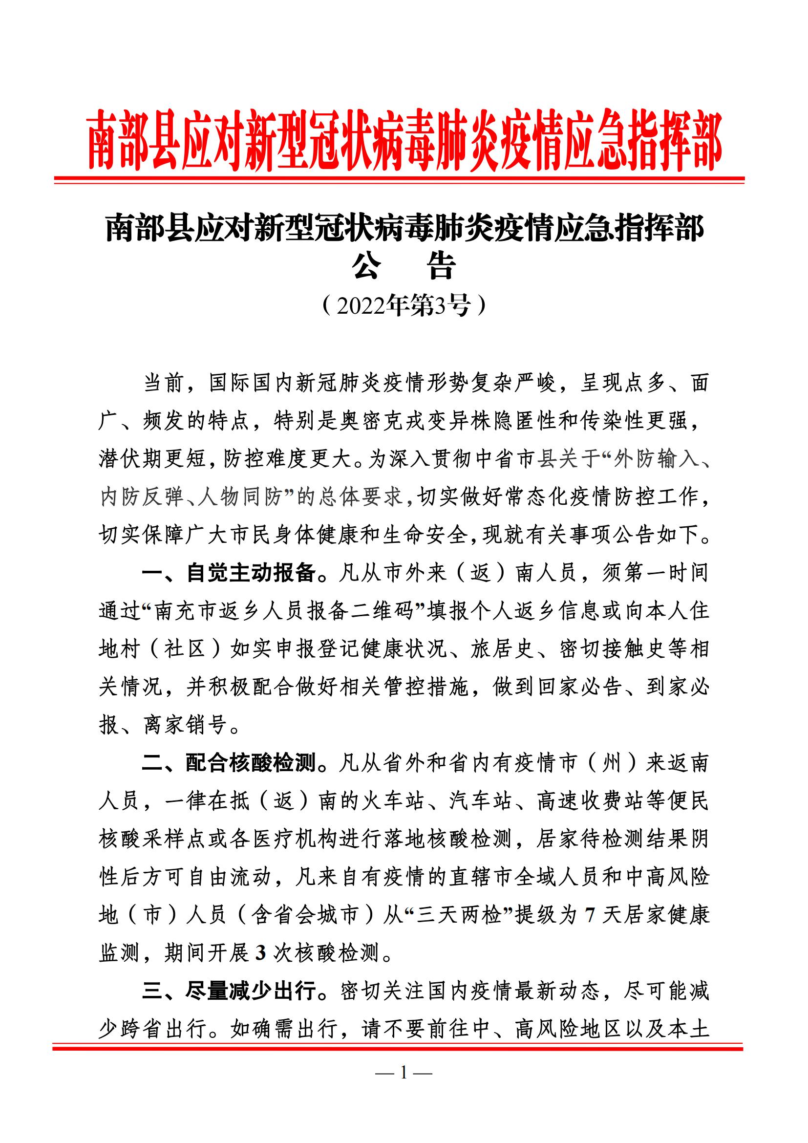 南部縣應(yīng)對新型冠狀病毒肺炎疫情應(yīng)急指揮部公告(2022年第3號)