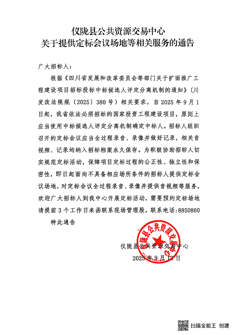 儀隴縣公共資源交易中心關于提供定標會議場地等相關服務的通告